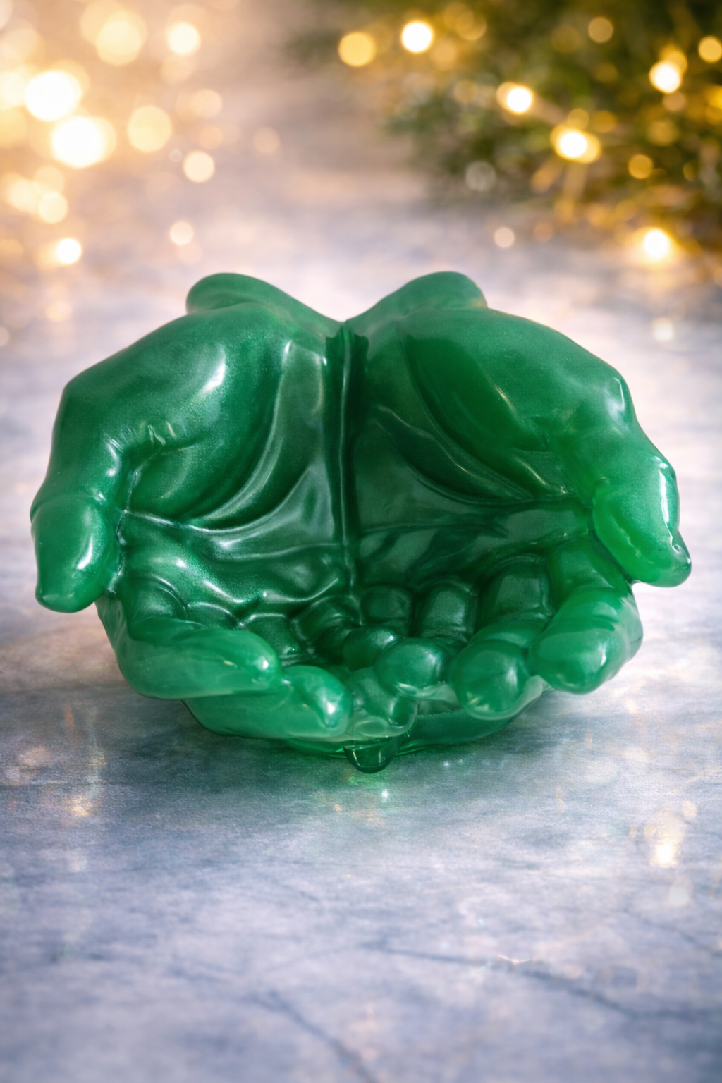 Unikaalne käsitööna valminud epoksiidvaigust kauss, mille kuju meenutab hoidvaid käsi. Ideaalne võtmete, ehete või muude väikeste esemete hoiustamiseks. Läikiv roheline viimistlus lisab sisekujundusele iseloomu ja erilisust.