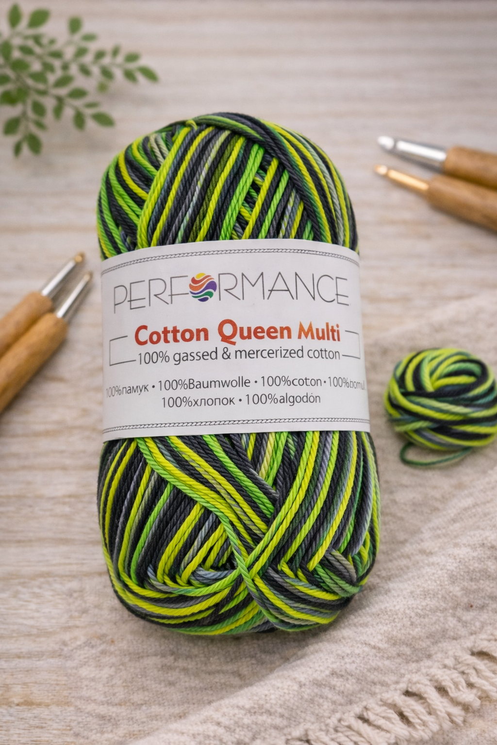 Cotton Queen Multi lõng. Koostises 100% puuvilla. 50 g ehk ca 125 m lõnga. Vardad/heegelnõel 2,5-3,5