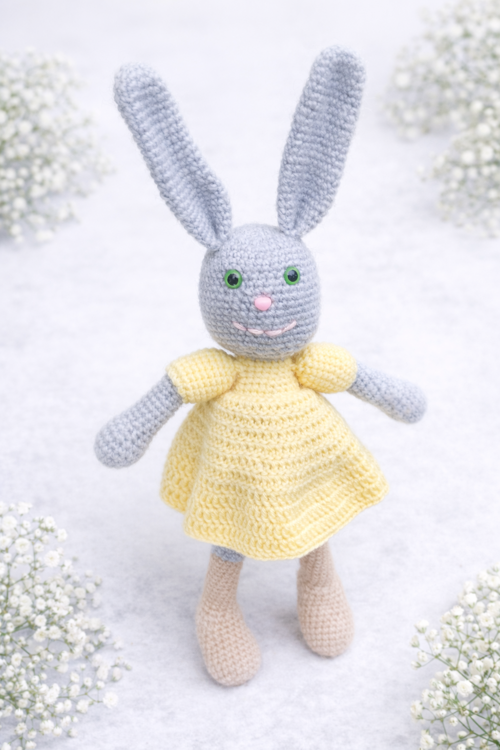 Kollase kleidi ja pruunide saabastega heegeldatud jänku. Üldpikkus 37 cm