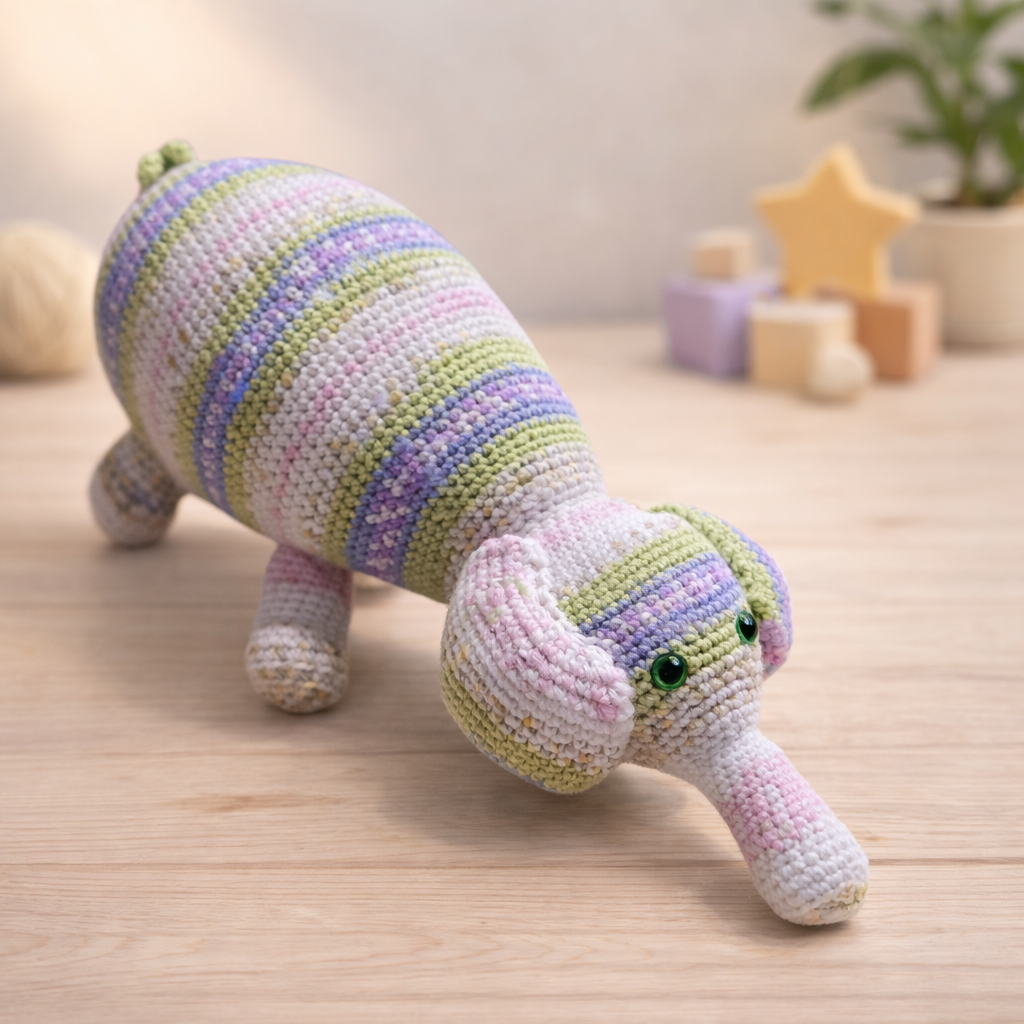 Heegeldatud. Pikkus ca 30 cm ja kõrgus ca 11 cm Heegeldatud NOVITA NIITY lõngast, mille koostis on 70% akrüül ja 30% polüamiid Täidetud mikrofiiber kiuga ja kasutatud turvasilmi