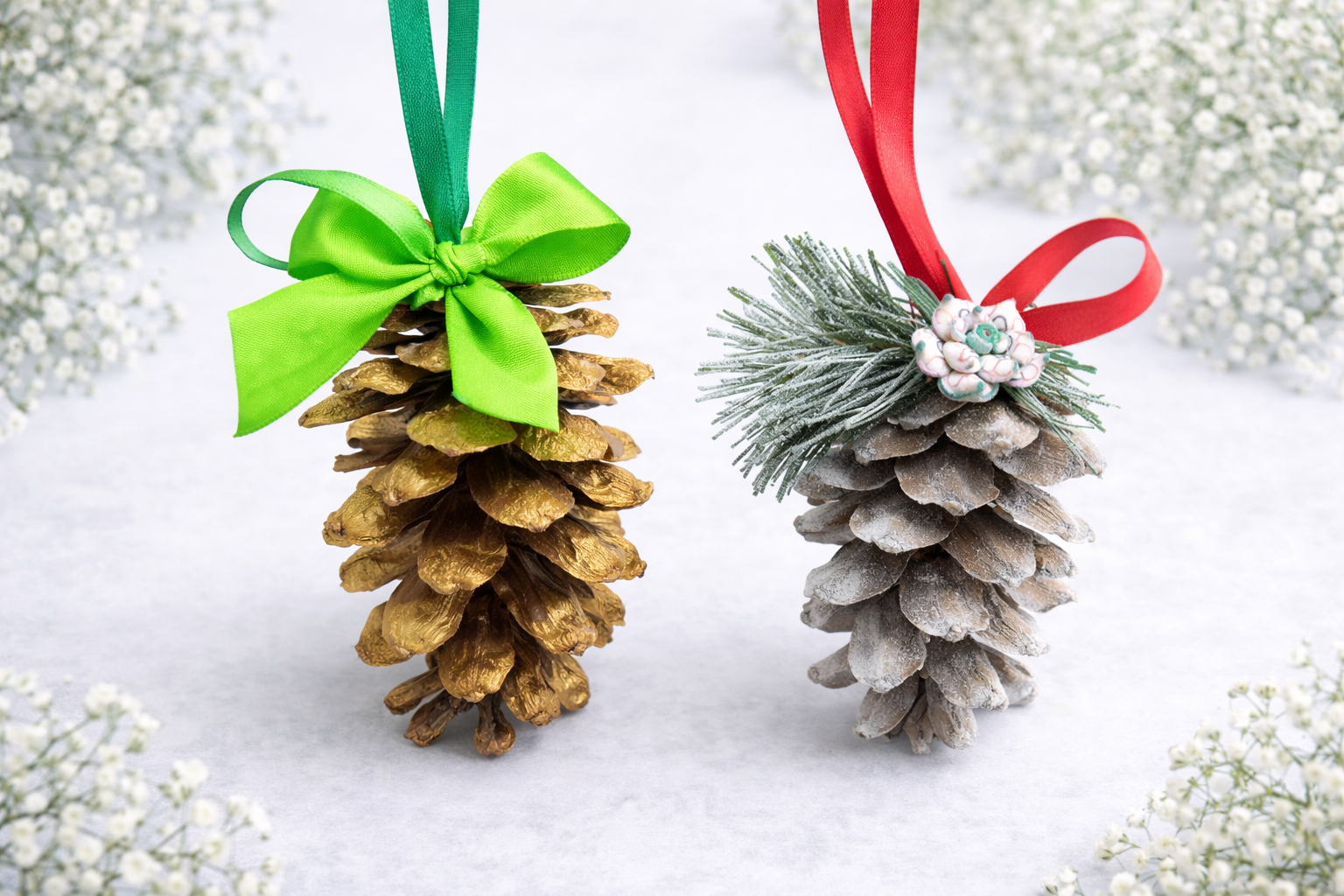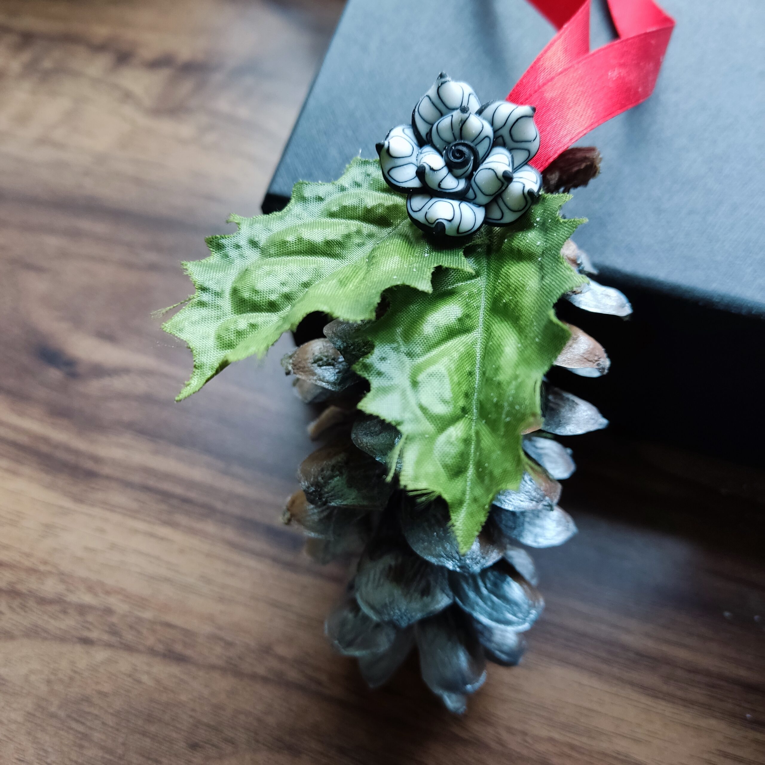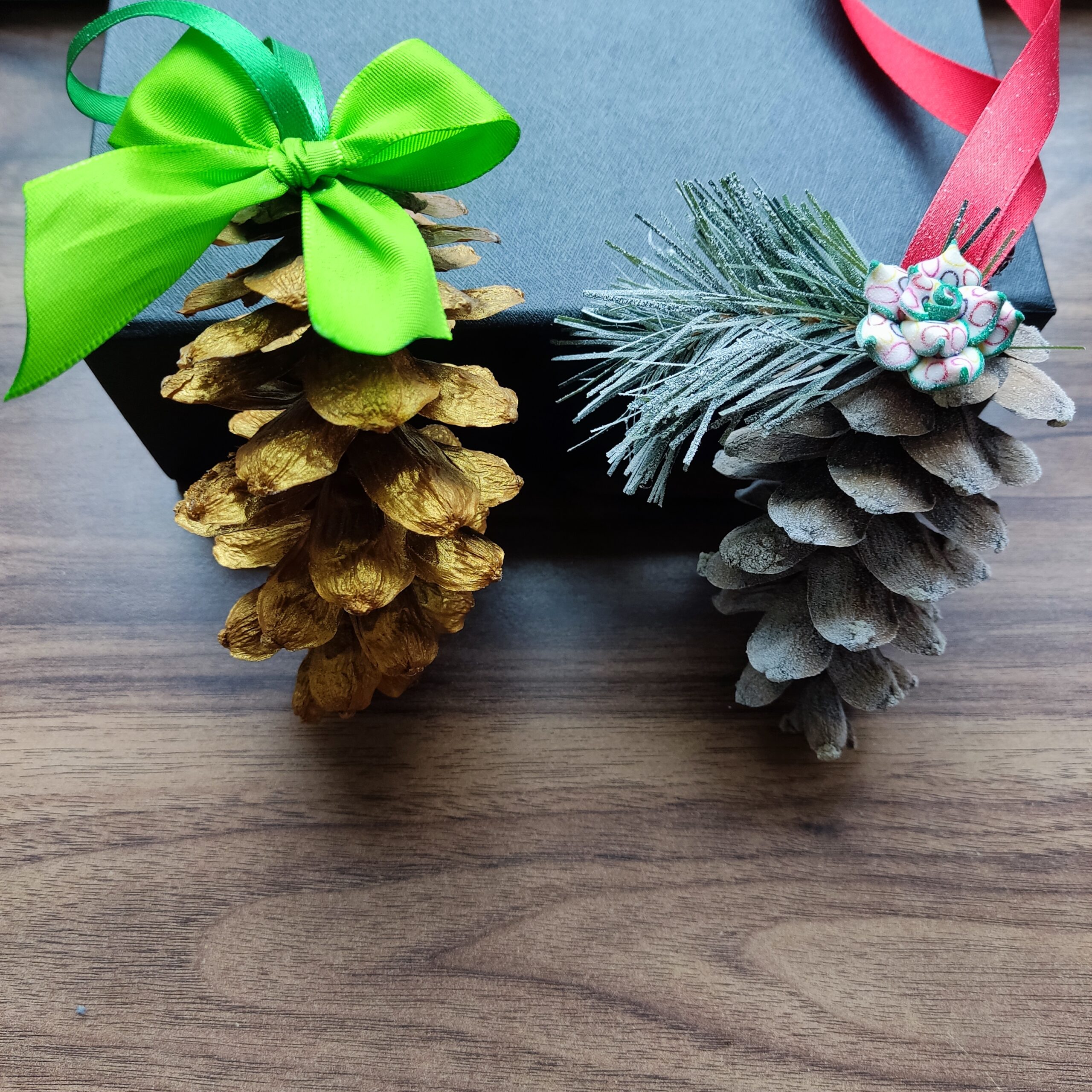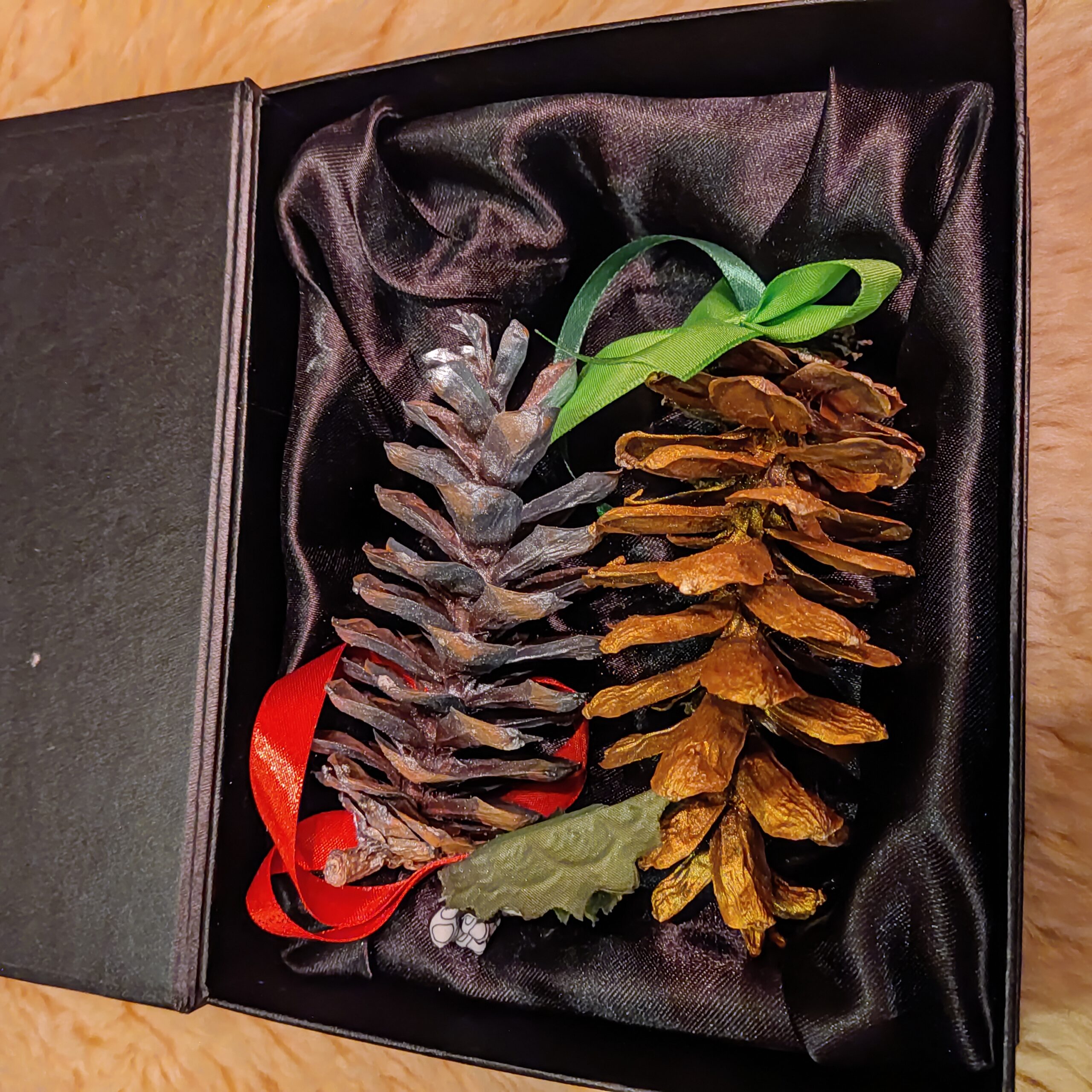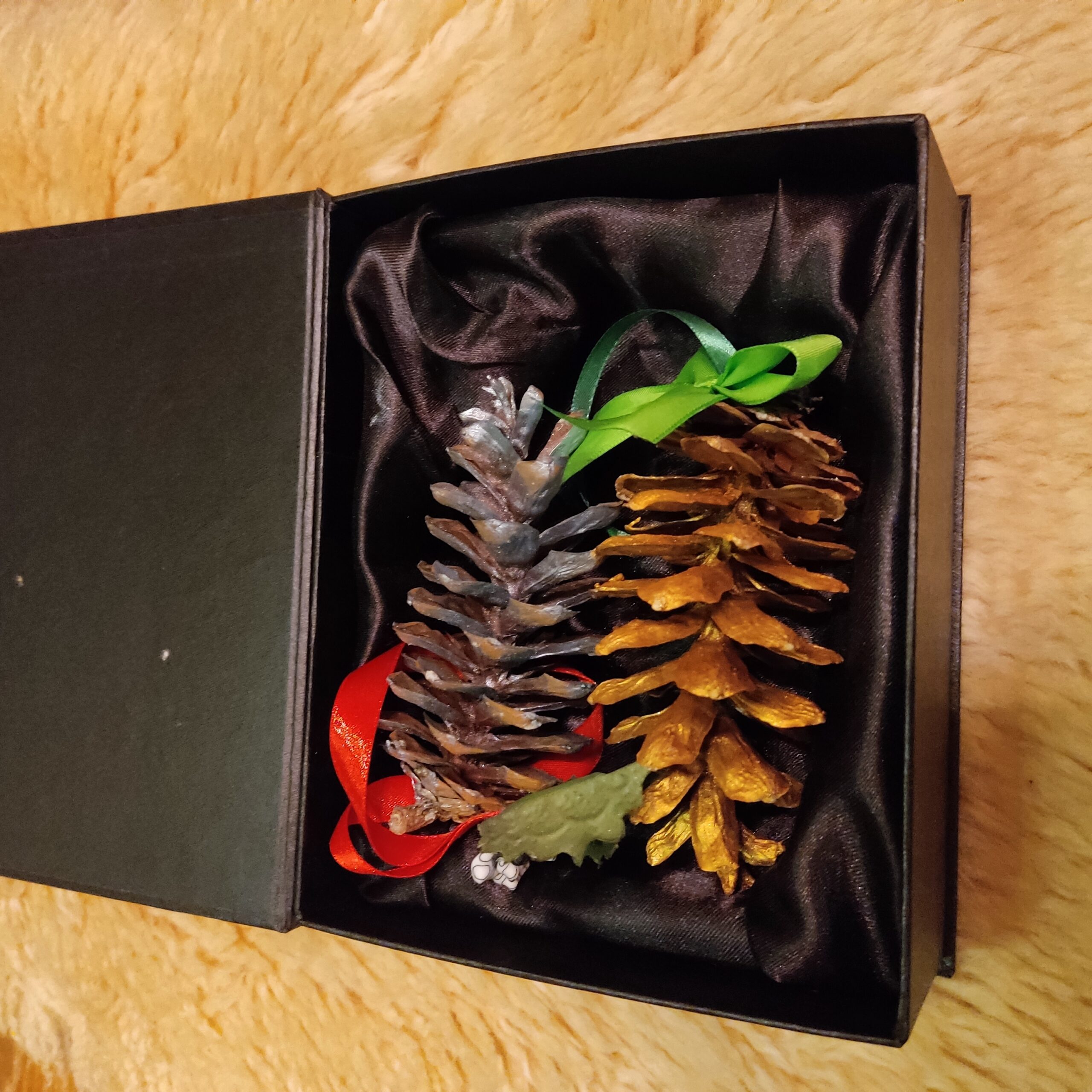 Käsitööna valminud käbidest jõuluehted väikeses kinkekarbis. Karbis kokku 2 ehet.
