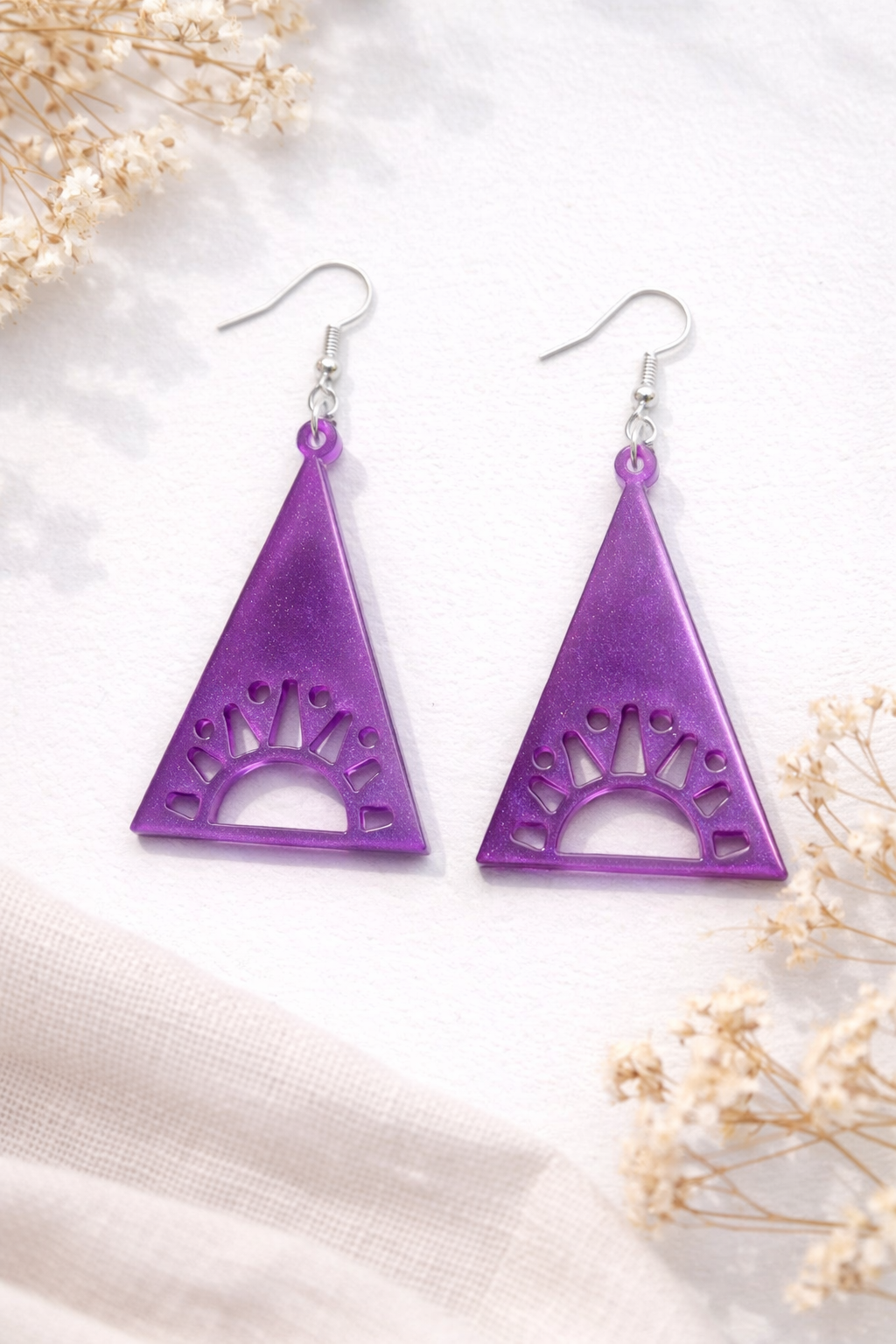 Käsitööna epoksiidvaigust valmistatud kõrvarõngad, hõbedased kõrvarõnga konksud.