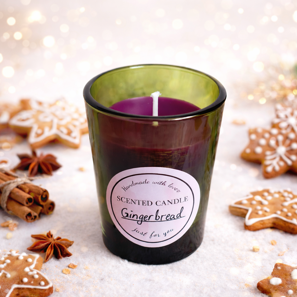 Käsitööna valminud parafiinist lõhnaküünal Gingerbread. Küünlatopsi kõrgus 10cm ja diameeter pealt 7cm.