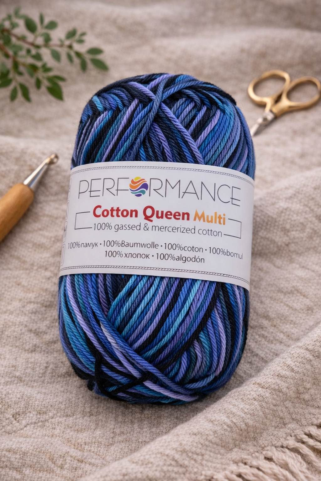 Lõng Cotton Queen Multi. Koostises 100% puuvillane lõng. 50 g ehk ca 125 m lõnga. Vardad/heegelnõel 2,5-3,5 mm