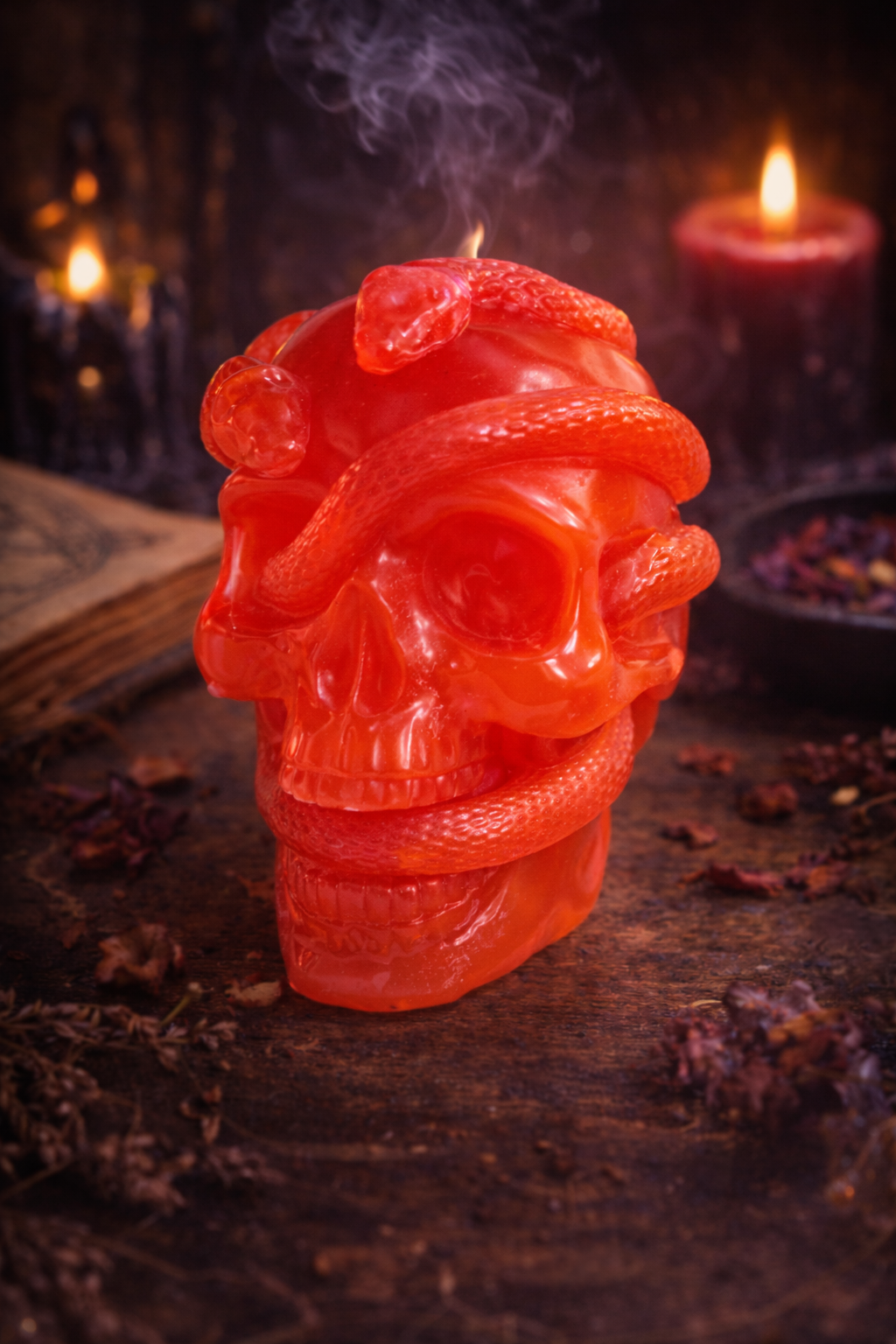 Silmatorkav punane kolju, mille ümber põimub madu. Detailirohke käsitöö ja läikiv viimistlus annavad sellele unikaalse ja pilkupüüdva välimuse. Sobib suurepäraselt alternatiivse sisustuselemendina või kingituseks neile, kes hindavad gooti ja müstilist stiili.