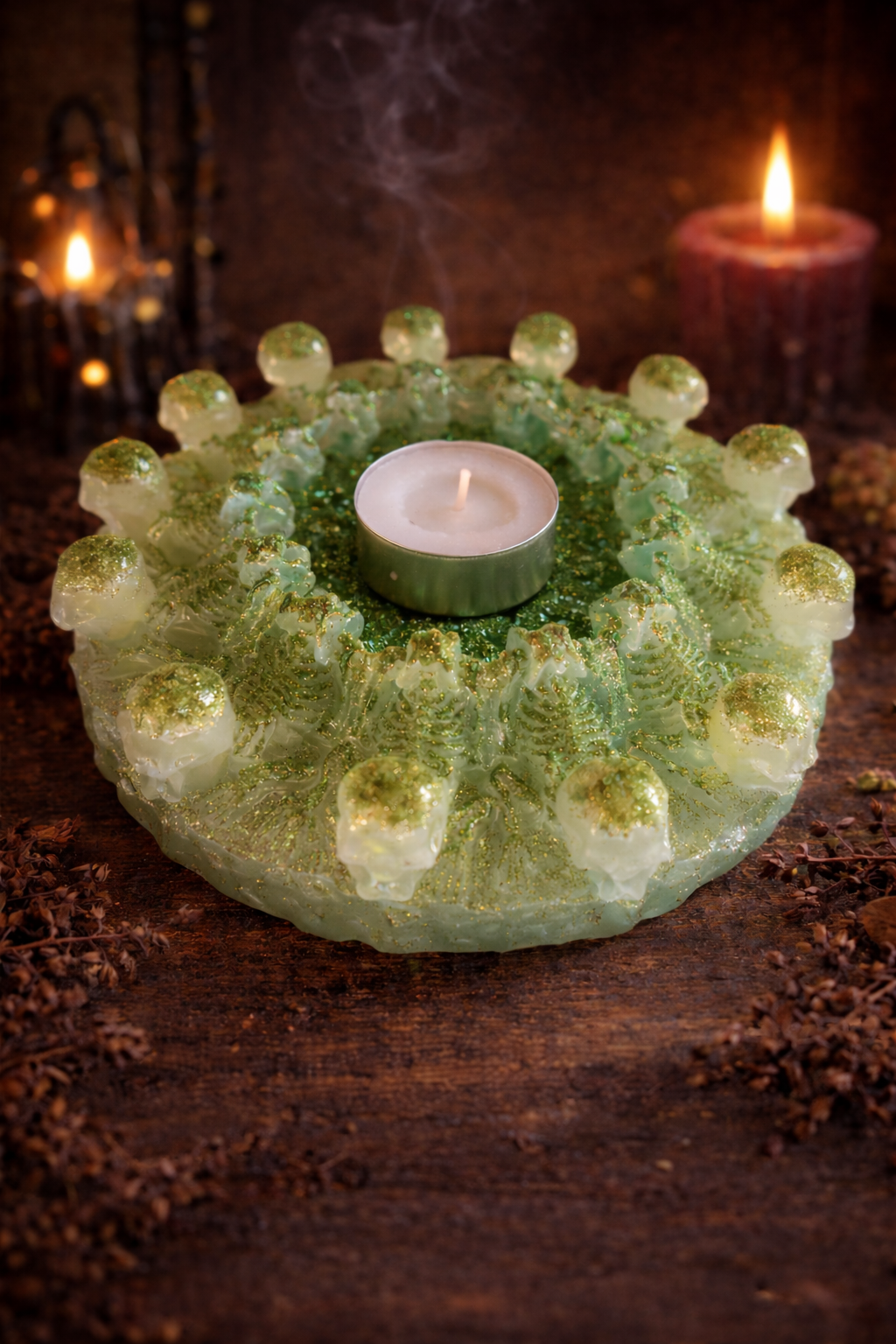 Lisa oma koju müstiline ja elegantne meeleolu selle unikaalse epoksiidvaigust teeküünla alusega. Käsitsi valmistatud detailne disain, millele lisavad sära kuldsed glitter-elemendid. Ideaalne nii kodukaunistuseks kui ka kingituseks.