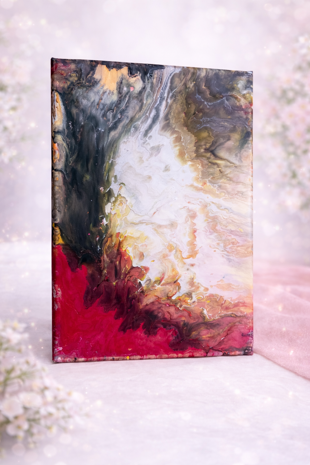 Unikaalne abstraktne akrüülmaal, mis ühendab endas nii vaikse liikumise kui puhangu intensiivset energiat. Maalil sulanduvad tumedamad metsarohelised ja okrutoonid heledate kreemjate virvendustega, justkui tõuseks valgus läbi udu. Alumist serva iseloomustab sügavpunane kontrast, mis lisab kompositsioonile elujõudu ja soojust.