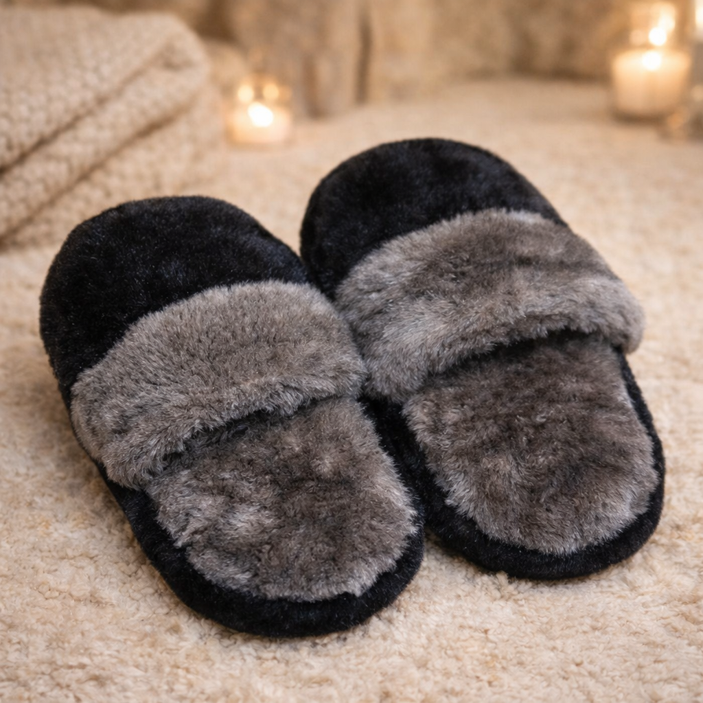 Kunstkarusnahast õmmeldud sussid. Tald sametine, talla täiteks porolloon. Mõnusalt soojad.