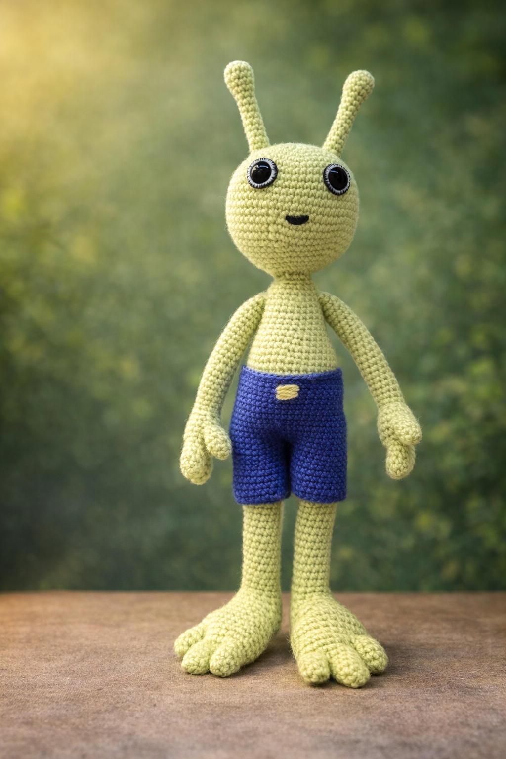 Tulnukas on heegeldatud rohelise mohäärlõngaga NOVITA Rose mohair, mille koostises on 65% akrüüli, 35% mohäär. Püksid on heegeldatud sinise DROPS KARISMA UNI COLOR lõngaga, mille koostis on 100% vill.